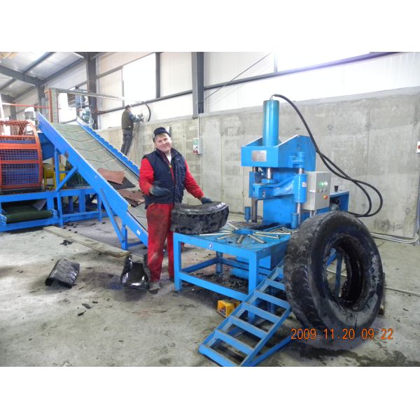 The machine is used to cut all kinds of tiers,including steel tires,fiber tires.The tires need to be debeaded before cutting into different size of rubber block.It mainly consists of motor,rotating platform,rolling shelf, fixed blade shelf,cutting blade shelf,bidy frame,cylinder,hydraulic station and control cabinet,and etc.